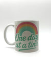 This beautifully crafted ceramic mug features a soft pastel rainbow and the uplifting words “One day at a time” on one side, and “Sobriety Social Club” proudly on the other. Whether you’re enjoying your morning coffee or a calming evening tea, this mug serves as a quiet companion in your commitment to self-care and sobriety.